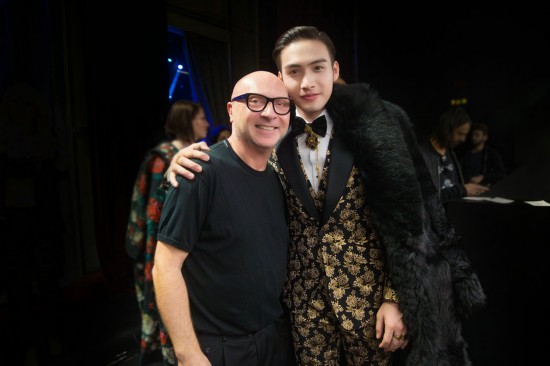 米兰当地时间1月13日,Dolce &Gabbana 2018秋冬系列“King’s Angel”主题时装秀在米兰举行,张彬彬变身模特走上T台献出首秀。他身穿金丝印花西装套装,外搭黑色长款外套,小领结配花型领针更添精致设计感。张彬彬在T台上化身霸道总裁气场全开,展现完美高贵气质。还在秀场后台与设计师Domenico Dolce交流合影。这也是张彬彬首次参加米兰时装周。