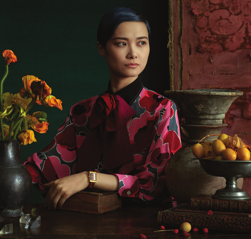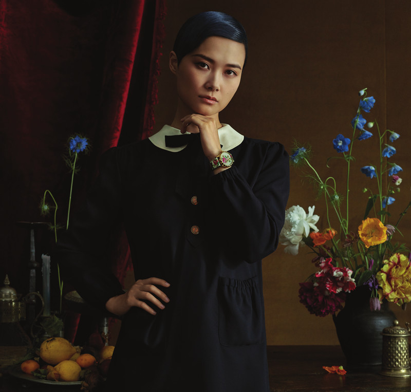 随意摆放的花卉、水果及形状各异的花瓶,令整体布景充满浓郁的古典韵味,置身其中的李宇春佩戴多款古驰全新腕表与首饰系列,呈现与众不同的个性风格。