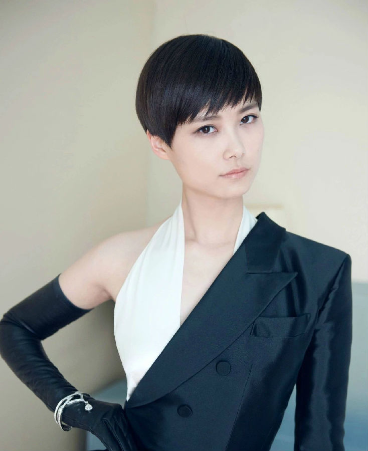 帅气的短发,加上立体剪裁的时尚高定服饰,严肃高冷。