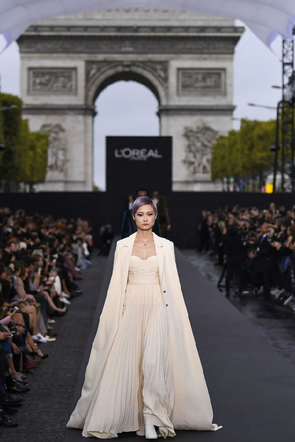 看看她去年给欧莱雅走的秀,一身全白的长袍内搭长裙,又压个子又拖沓,难度不低,但她很好地hold住了。