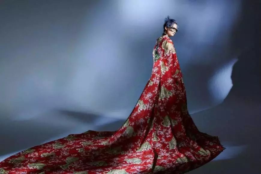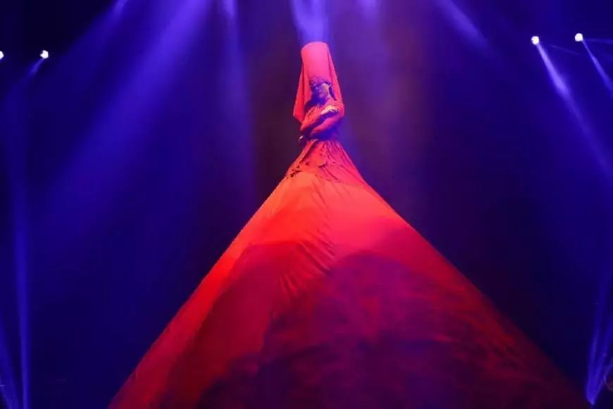 最惊艳的无疑是这件从高处铺泻而下,铺满整个舞台的八米红裙,春春头戴镶钻红色华冠,低眉吟唱,纤臂伸展,神秘感与视觉冲击感扑面而来。光影投射在红色的头冠和裙摆上,迷幻绚烂,芳华绝代。