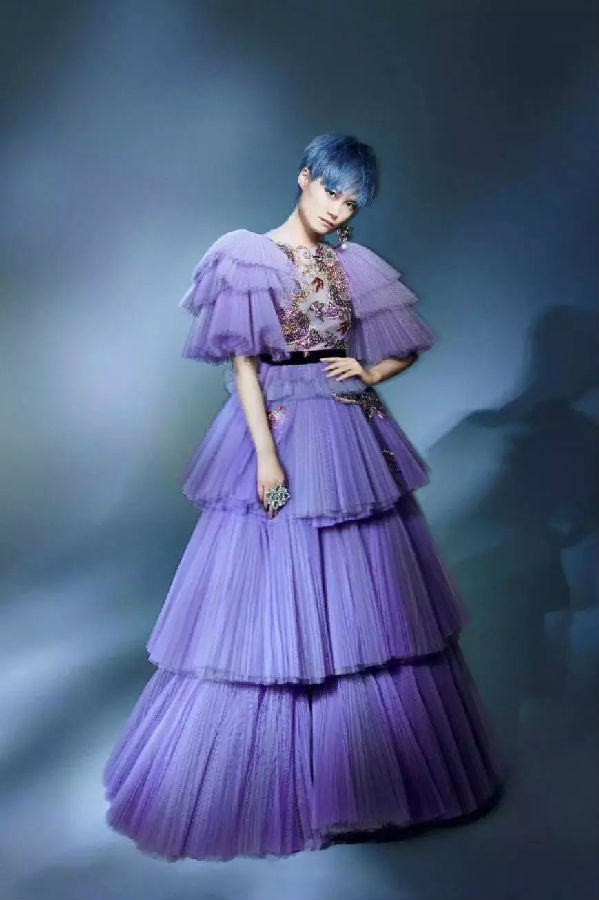 精巧动物刺绣图案的浅紫色褶皱礼服长裙,耳朵上是大大的复古金属加珍珠的耳环,手指上的钻同样大得吸睛,搭配一头酷酷短发,既仙又酷,能将“蛋糕裙”穿出帅气的高级感,也就只有李宇春了吧。