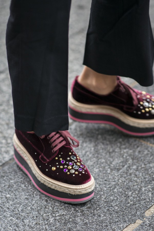 今年超级大热,丝绒的厚底鞋当然不能少,其实丝绒不大面积穿,用鞋包等小单品点缀会更好,日常还时髦。
