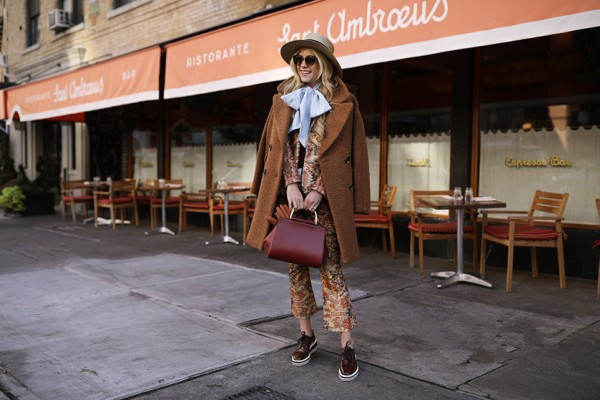 博主Blair Eadie一身棕色的Look,用一双深棕色的布洛克雕花鞋来搭配,色调统一,中跟的厚度又不会显得很突兀。