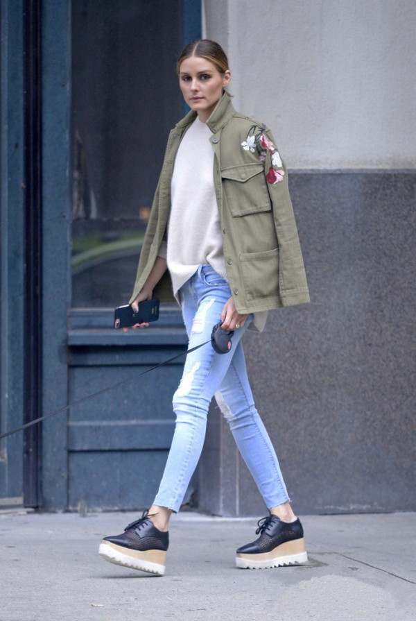 上半身比较宽大的外套搭配厚底鞋效果最好,穿超高跟的款式才能撑起整体的造型,让上半身看起并不肥大。