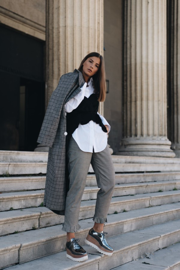博主Nina Schwichtenberg一身复古的格纹Look,搭配银色超高跟厚底鞋,色调非常统一,金属色的厚底鞋可谓是全身的小亮点了,英伦复古风不减的同时,还具有带来一丝酷感。