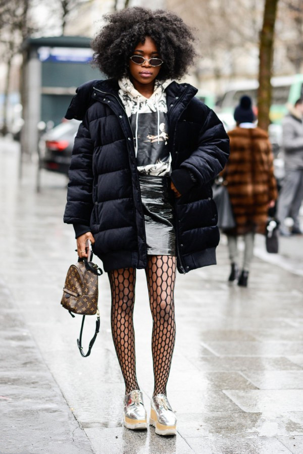 半裙渔网袜满满活力和酷帅感,一双厚底鞋修饰腿型还让人感觉很活泼。