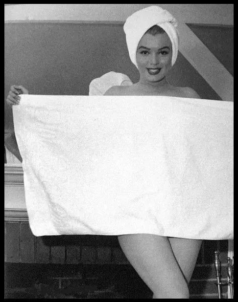这张图片是梦露于1953年在 Bel Air酒店拍摄的,道具就是一条酒店里最普通的纯白浴巾,梦露将头发用毛巾包起,仿佛刚出浴,让人浮想联翩。