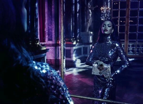 无独有偶,Steven Klein在2015年为Dior拍摄的硬照及视频中,又一次使用了镜子。Rihanna身处凡尔赛宫,银色亮片连衣裙在幽暗的灯光下散发出斑驳亮光,未来感的装扮由宫殿古老的镜子反射出来。一种奢华孤傲的性感油然而生。