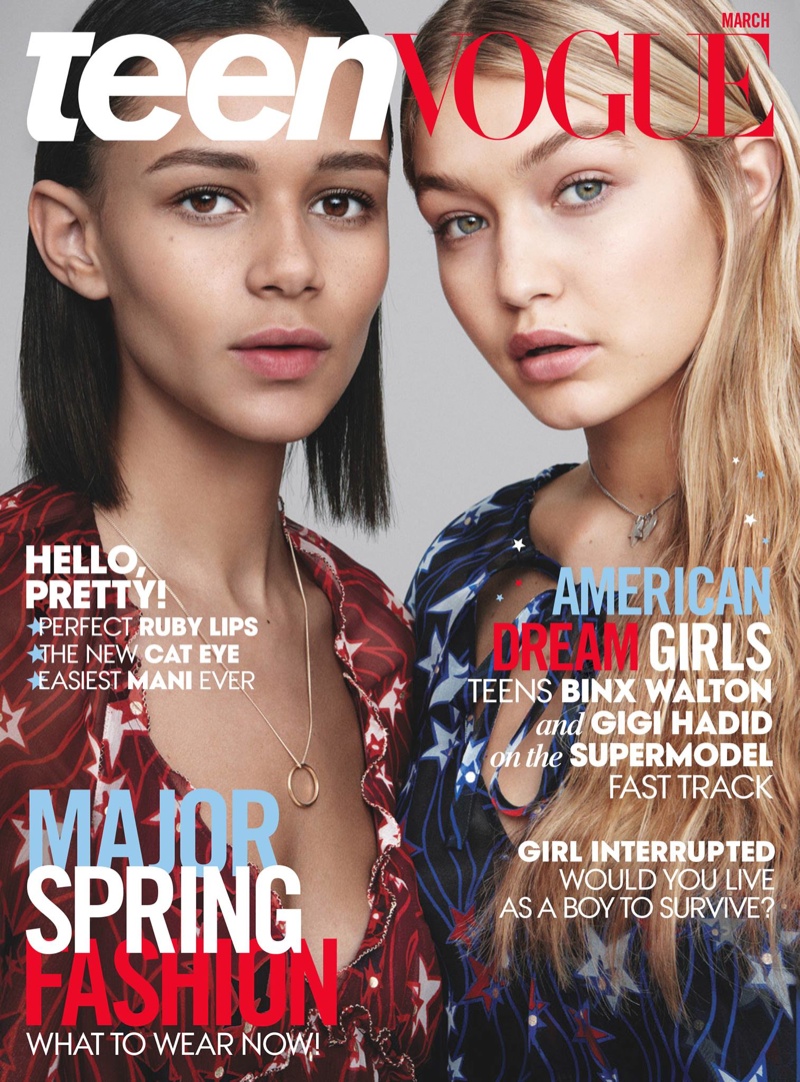 近日,嫩模吉吉哈迪德(Gigi Hadid)与新晋超模宾克斯沃尔顿(Binx Walton)一起登上《少女时尚》(Teen Vogue)2015年3月刊杂志封面。