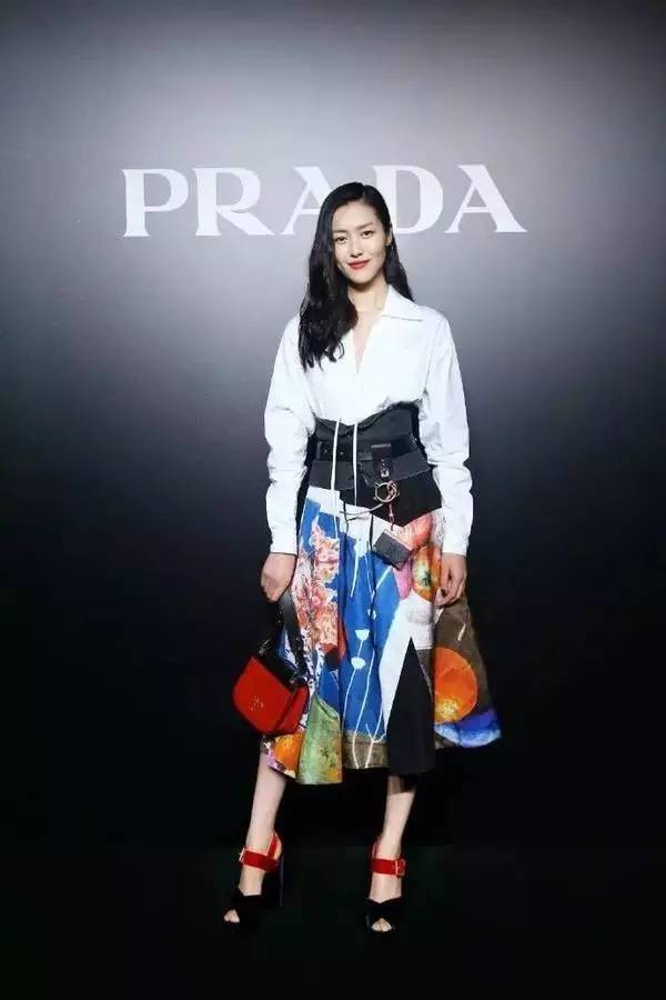 身着Prada白色衬衫及印花半裙,搭配红蓝拼色天鹅绒高跟凉鞋,手持红黑拼色Pionnière手袋,出席上海举办的Prada上海恒隆广场店重装开业活动酒会。