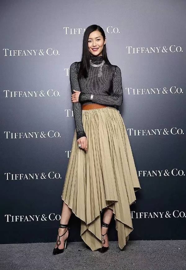 参加蒂芙尼(Tiffany & Co.)高级珠宝活动时,高领针织衫搭配不规则百褶裙,知性优雅,而佩戴的18K 白金镶钻腕表以及瀑布白钻项链,则尽显独特个性与灵动气质。