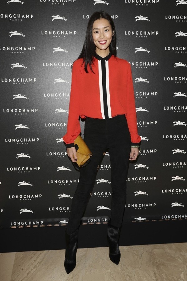 参加珑骧(Longchamp)活动时,一款条纹衬衫+高腰小脚裤的look尽显高挑好身材,干练十足。