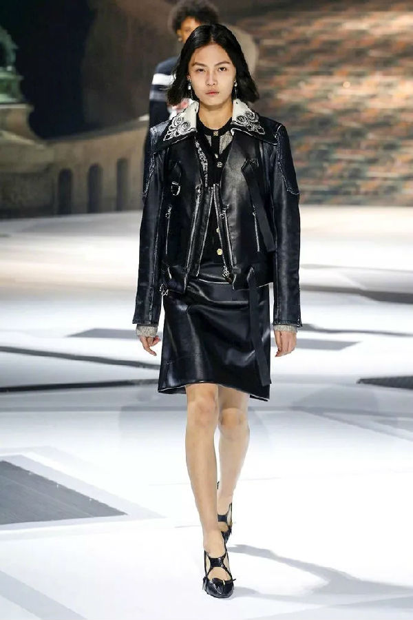 赵佳丽身穿黑色的皮夹克搭配黑色的小皮裙,依旧是那清冷的面孔,在T台上的赵佳丽看起来更有气质。