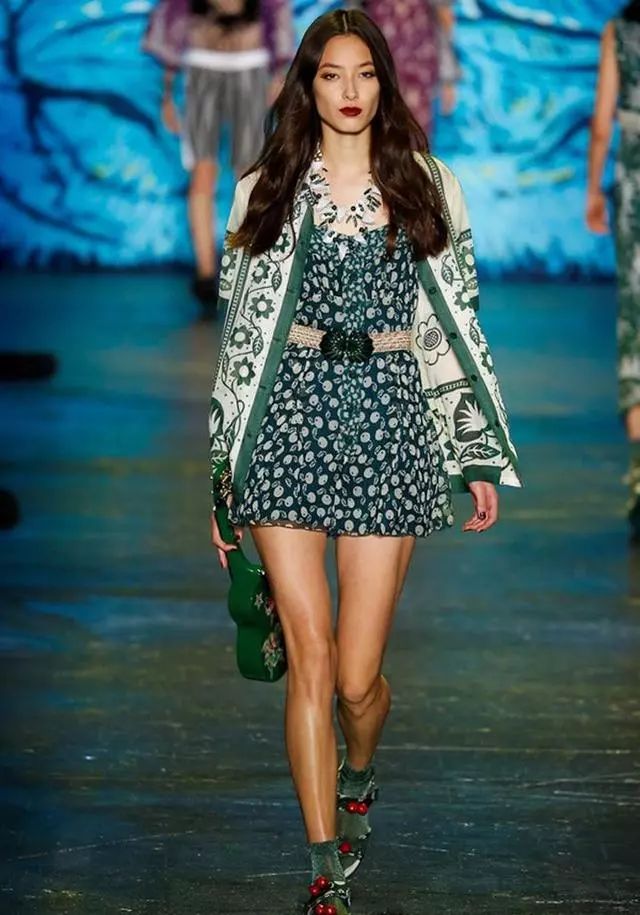 18年大热的印花元素,Tiana早在16年的Anna Sui大秀中,就示范过正确的打开方式啦,内搭是深绿的小碎花连衣裙,外搭的大印花突出了搭配的层次感。