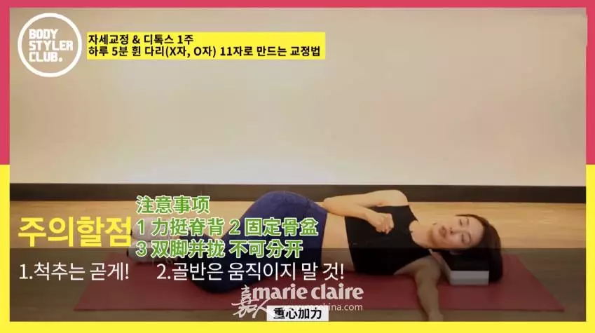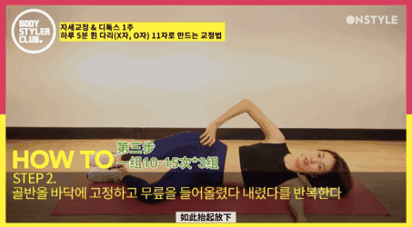 侧身平躺在瑜伽垫上,双腿弯曲90°,双脚不动,抬起双膝向上然后放下,如此反复10~15次为一组,总共做三组。