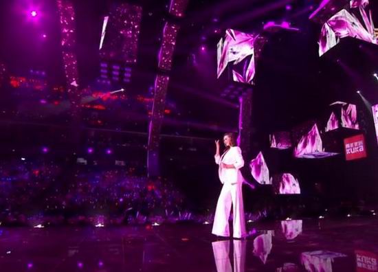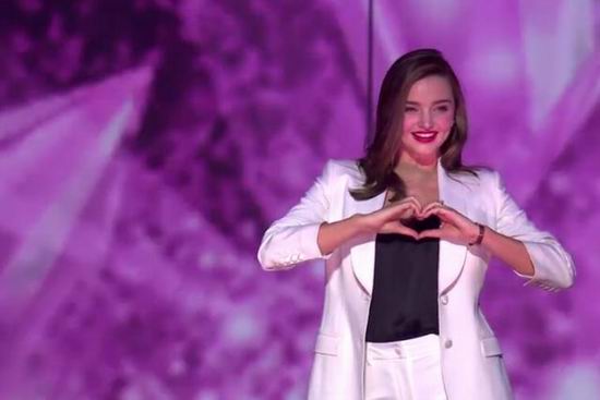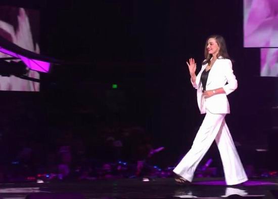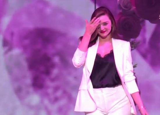 自然的走完了只有她一个人却引起全场轰动的秀,还在现场唱起了中文歌《玫瑰玫瑰我爱你》,这让全场观众兴奋不已,估计米兰达可儿来中国之前有经过无数次的练习,哈哈,实话说,这中文歌确实唱得不怎么样,但毕竟是一位不会说中文的美女啊,能唱到这个状态已经很好了。
