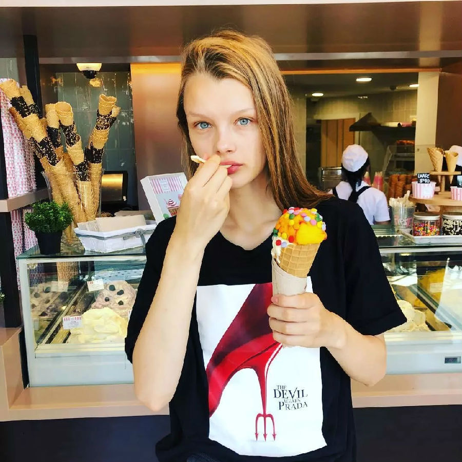 这张照片中,她身穿简单T恤,印花则是《穿Prada的女王》电影封面,果然是Prada钟爱的缪斯,手拿彩色糖果冰淇淋,清新纯净的好似邻家女孩。