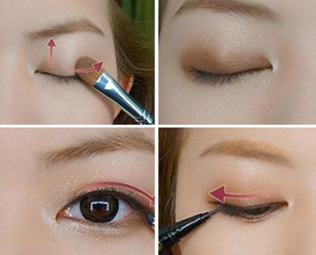 抬起上眼皮,用眼线笔填补睫毛根部空隙,让眼睛更大。