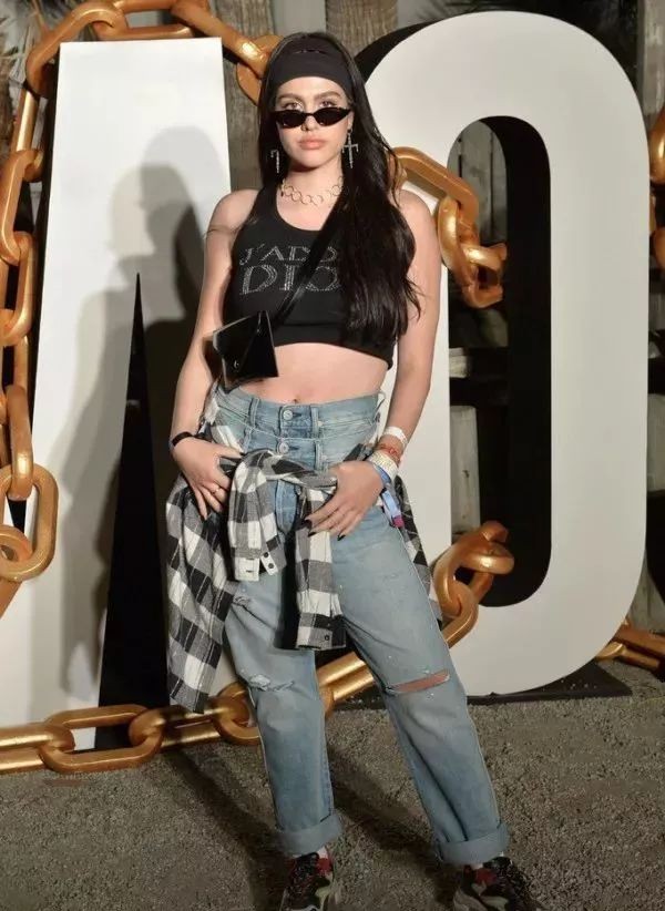 Amelia Gray Hamli 则有点嘻哈的感觉,黑色字母Crop Top搭配破洞牛仔裤,腰间的格子衬衣加以点缀,演绎酷炫的街头范儿。