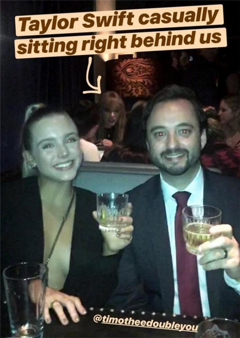2018年3月15日讯,近日网友意外捕捉到了正在与姐妹聚餐的泰勒斯威夫特。霉霉一头金发,身着黑衣,虽然像素极低,但还是能认清霉霉的面貌。Casimere还特意做了标注:“Taylor Swift casually sitting right behind us。(泰勒斯威夫特居然就坐在我们后面)”。