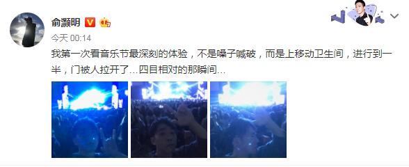 俞灏明本人在1日凌晨也发文畅谈参加音乐节的感受,除了音乐节气氛很high之外,俞灏明还遇到了小尴尬,他在上卫生间的时候,门突然被拉开了:“第一次看音乐节最深刻的体验,不是嗓子喊破,而是上移动卫生间,进行到一半,门被拉开了...四目相对的那瞬间....”