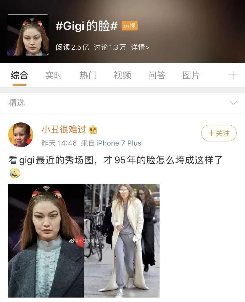 甚至微博热搜#Gigi的脸#还直接冲了上来,获得了高达2.5亿次的阅读!