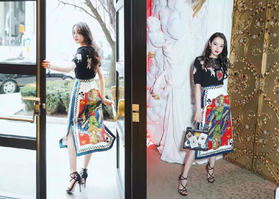 迪丽热巴身穿印花半身裙出席D&G秀场,开衩的设计将其妩媚的女性气息表现得淋漓尽致