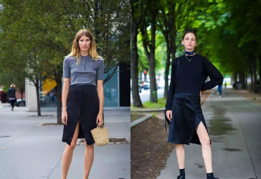 如果你想在优雅之余再多一点小性感,那一定要尝试一下开叉半身裙这个超撩人的单品。黑色开叉裙超级百搭,选择同色系的搭配更显高级,如果想有亮点,那么一条印花丝巾就可以打破这种单调感