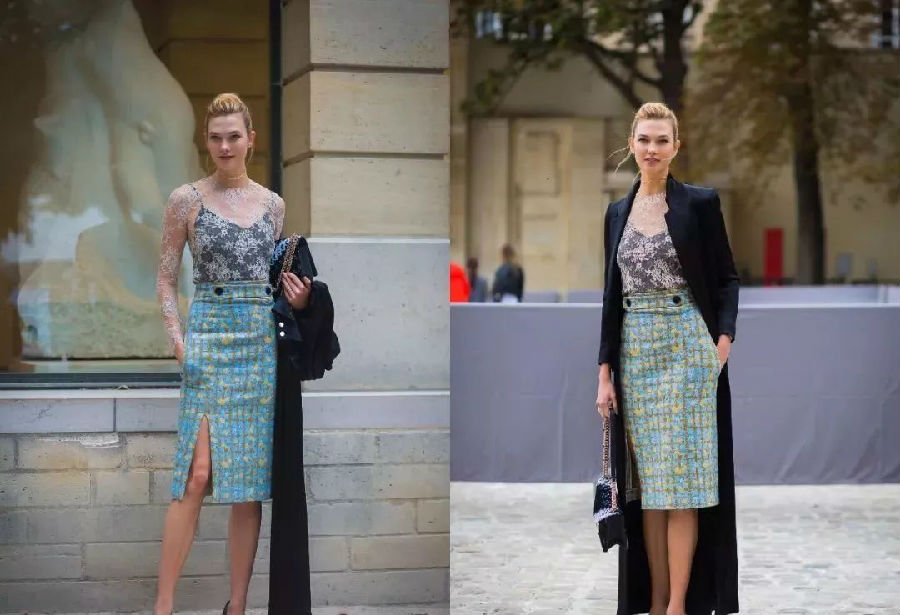 如果你想尝试高调的印花开叉裙,搭配简约的上衣才不会显得浮夸。Karlie Kloss一席清新淡雅的印花裙加上若隐若现的侧开衩设计搭配一件透明蕾丝打底上衣,优雅气质max