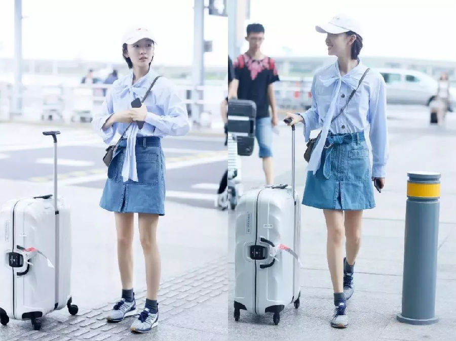 开衩短裙是小个子们的救星,周冬雨一身清新蓝衬衫搭配牛仔开衩短裙,开衩的短裙不但有显高的效果还给人一种青春活力的感觉,校园风十足