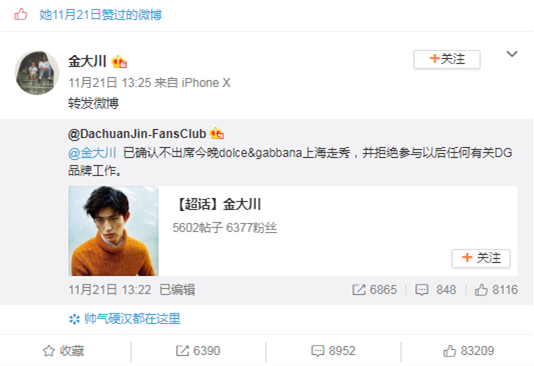 前段时间,D&G辱华事件闹得沸沸扬扬之时,金大川率先发声确认不出席上海DG走秀,并拒绝参与以后任何与DG品牌相关的工作。Cici随后点赞了此条微博,老粉感慨万分,以为复合有望时,Cici则淡然表示自己会点赞许多东西。唉,当爱已成往事,只剩粉丝们心存一丝侥幸。
