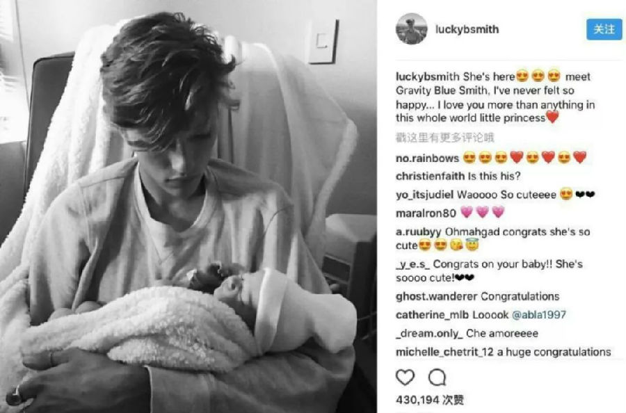 女儿出生的时候,Lucky Blue Smith发了一张自己小心翼翼抱着女儿的照片,说 道:感谢你来到我的世界。