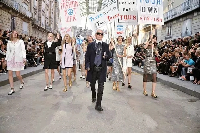在2015年的春夏高定秀上,老佛爷又将秀场打造成了香奈儿大道,不仅完美呈现了街头景观,还在谢幕之时,带领模特们高举女性主义标语,以抗议者的身份走上街头。