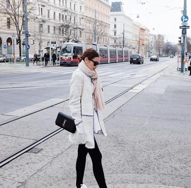 白色的外套搭配黑色裤袜看起来就比较日常,黑色的链条包包精致又时髦,小白鞋显得KelseyMerritt超级亲切可人!