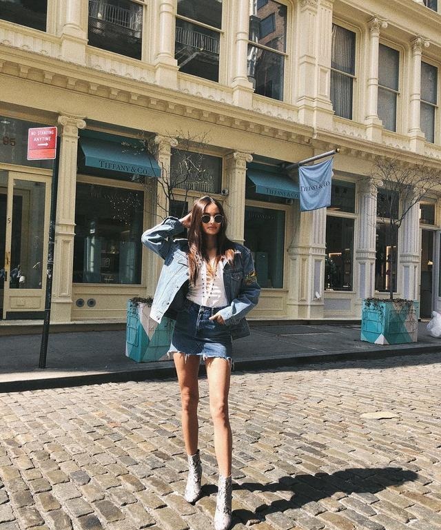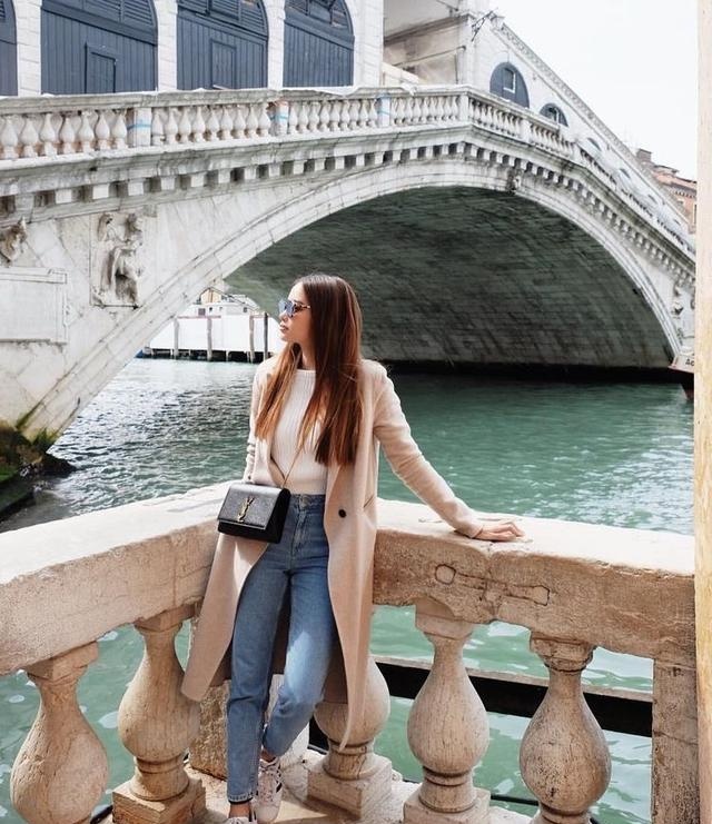 白色上衣搭配高腰牛仔裤既日常又不失质感,外搭长款的米色外套增添了几分气场,一双小白鞋很休闲大方,真是人比景色更美!