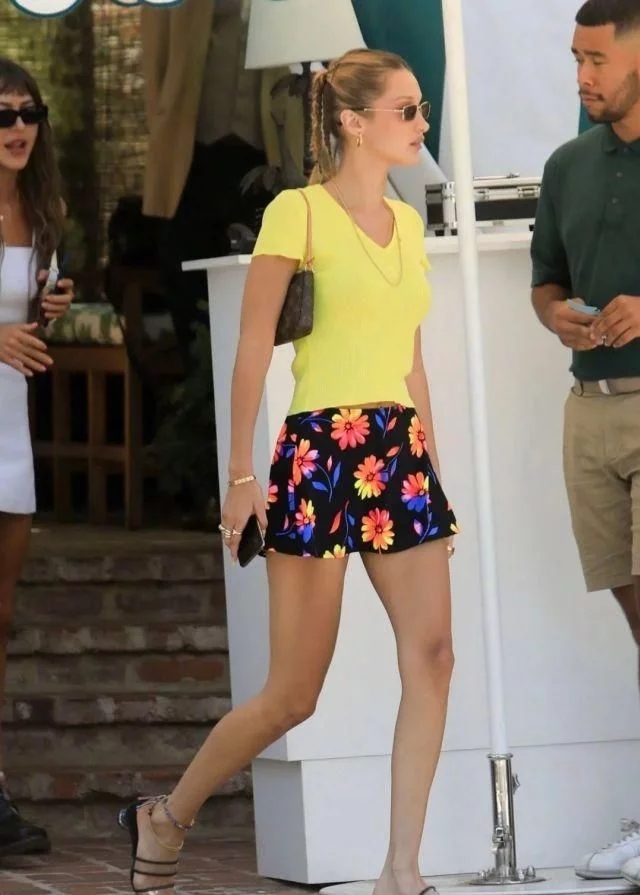 这套搭配是比较少见的甜美少女感的风格,Bella上衣穿的是一件黄色的针织衫。V领的款式很好的凸显出脖颈线条,紧身的设计更是将身材比例很好的展现了出来。裤装搭配了一条黑色的印花短裤,将一双大长腿很好的展现出来,同时这件裤装也特别的亮眼吸睛。鞋子搭配的是简单的PVC拖鞋,可以很好的凸显出腿部线条,配带着时髦腋下包扎着马尾辫的Bella看起来甜美中又透露着帅气。