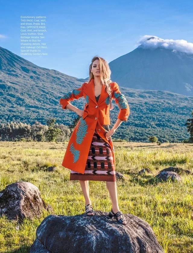 不得不说,糖糖近一年来的状态都不算特别好。上杂志的表现也有点勉强。比如这一身印花橙色长风衣,配上内衬印花长毛衣裙,这样的混搭衣着配一个浓艳的红唇就会颇为精神,但却配了裸色口红,顿时没啥生气,再配上挡住半边脸的湿漉漉的头发,既不性感也不野性,反倒很是疲惫。