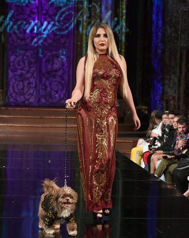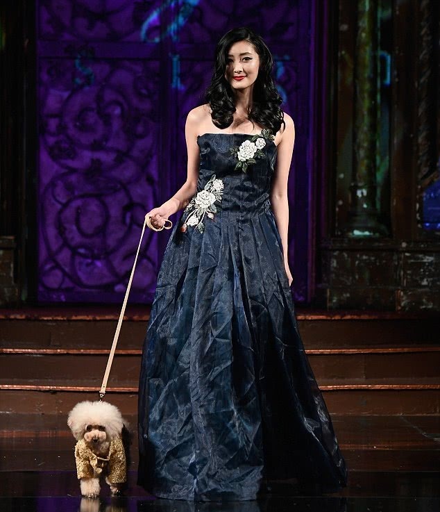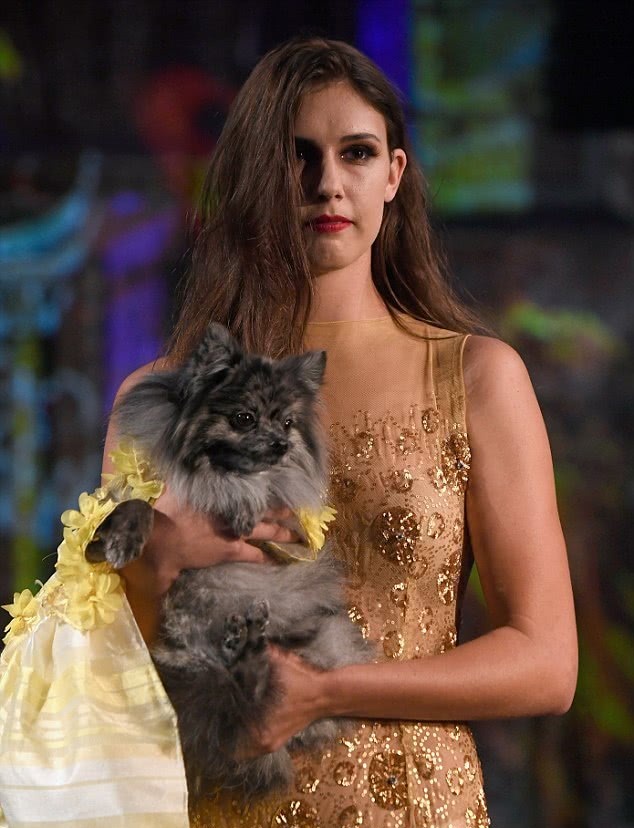 这位穿着鲜花主题薄纱裙的美女模特,不仅从容地走着猫步,右手还牵着一只可爱的宠物狗,而宠物狗身上的服饰也非常地华贵靓丽,一圈台步下来观众们来说:简直就是双重视觉刺激。