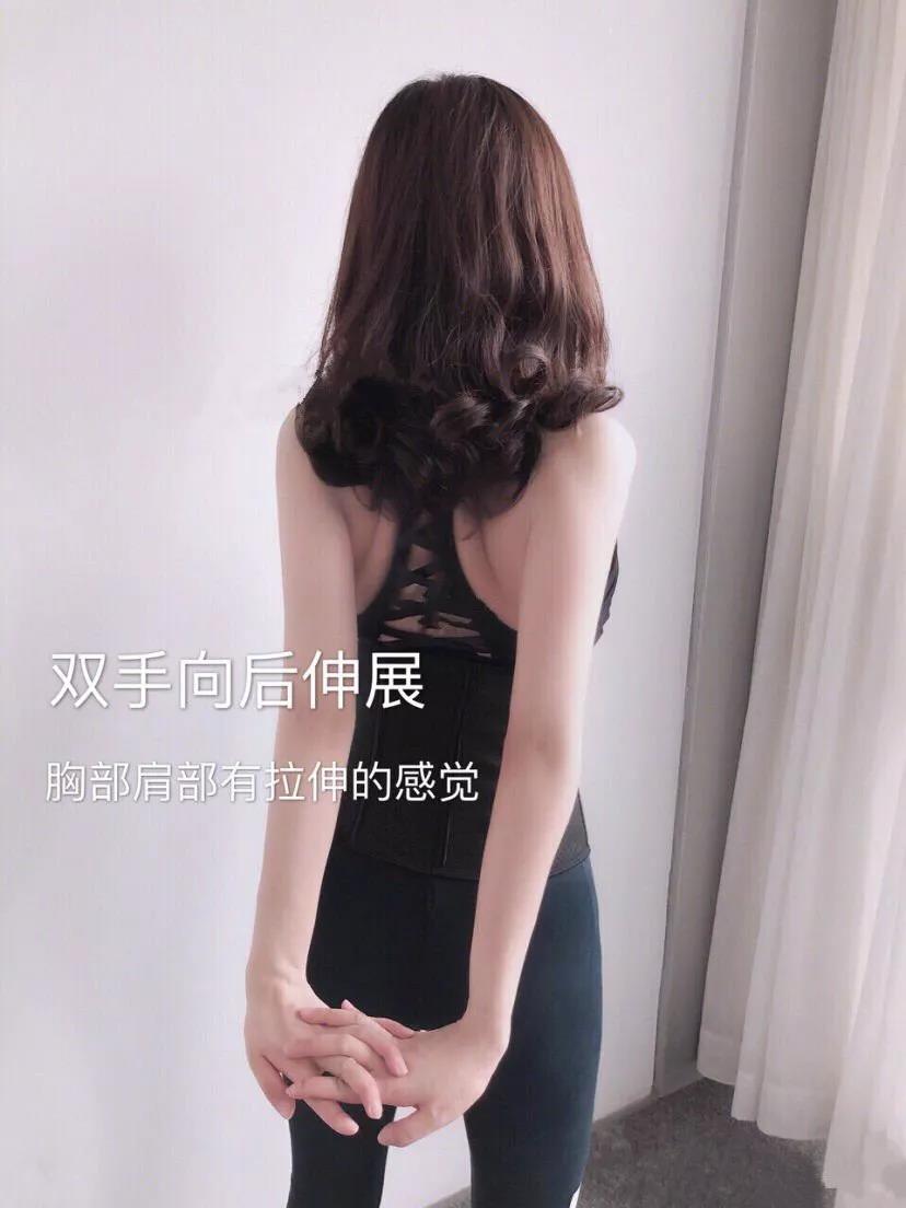 3. 双手向后伸展 有点像我们平时伸懒腰的动作 不过一定要用力向后伸展 手臂背部要有拉伸的感觉才行哦