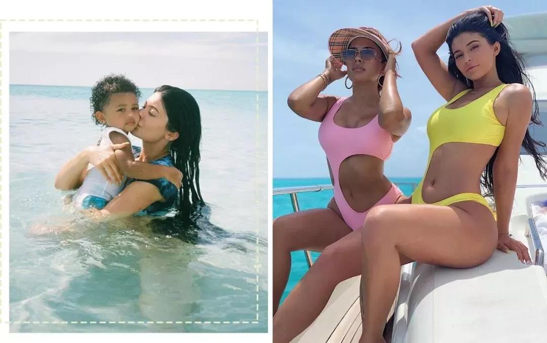 最近凯总也在ins发布了几张泳装look,一边展示傲人线条,一边有爱地抱着女儿Stormi亲亲,太幸福啦▼