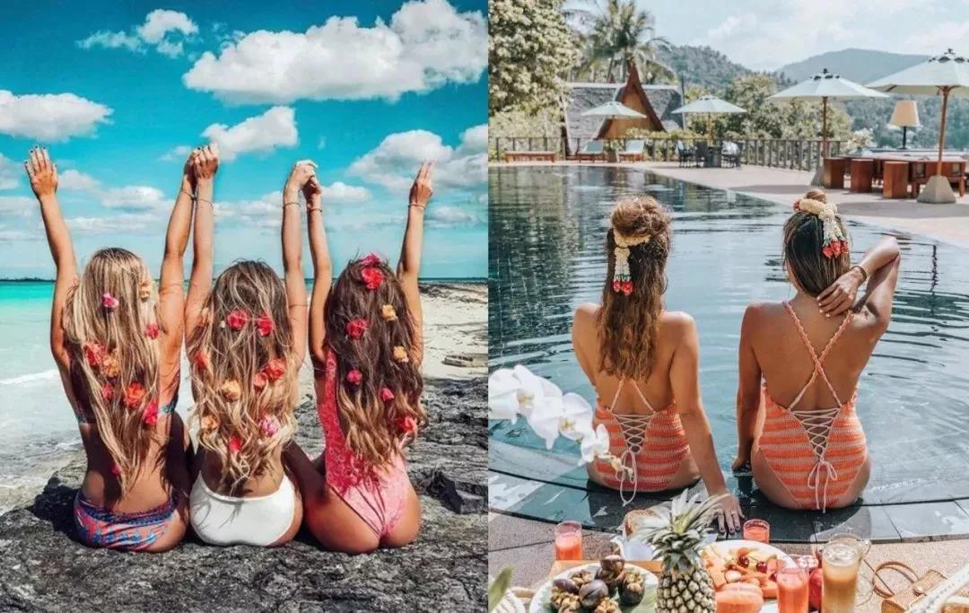 一个人拍背影略显孤独,叫上姐妹排排坐面朝泳池、大海就很美,都不用俢图了~▼