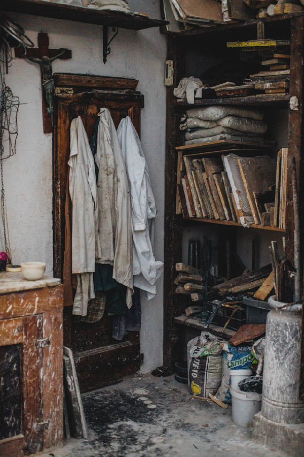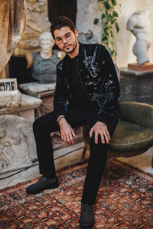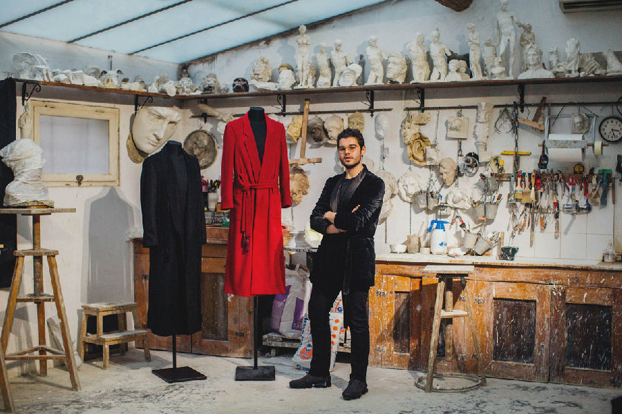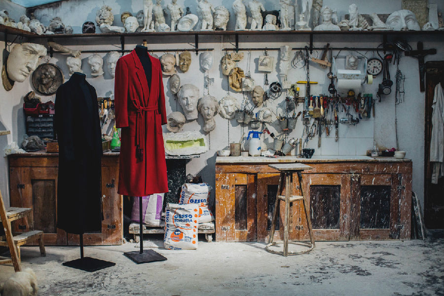 在客人们冒雨赶到这间工作室之前,一切都是静悄悄的。Robert Cavalli自信地步入,黑色的头发油光水滑地向后梳起,语气轻柔。与文艺复兴时期的雕塑和雕塑工具摆在一起的是,穿着天鹅绒和丝绸无纽扣大衣和外套,以及带有石榴纹样刺绣的提花面料慢跑裤的人台模特。除了金属腕表和Nike Vapormax球鞋,Cavalli本人也穿了一身黑,戴着金丝眼镜,其身上那件类似晨袍的无纽扣外套也来自他的新系列。他的手上有一个纹身,写着字母“R”,很快,他就向我们解释了自己新品牌的3个“R”的意义:Roberto代表他的父亲;Robert代表他自己,第三个“R”,他笑着说道,代表着这个品牌本身。