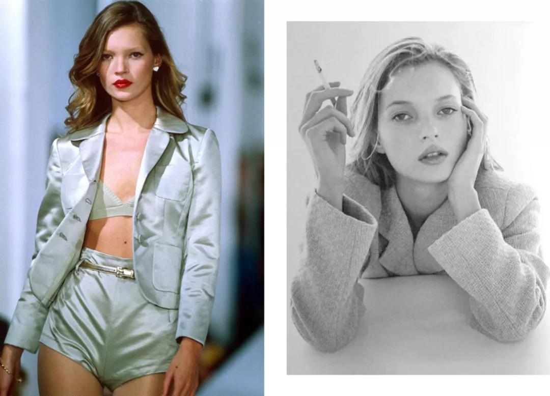 英国模特 Kate Moss 以她病态式的颓废气质走红。虽然 170cm 的身高在一众超模中显得矮小,但仍然不能阻挡她受到各大品牌设计师的喜爱,走秀、代言都不在话下,是90年代实至名归的 Fashion Icon。