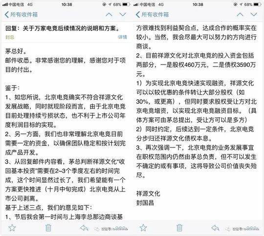 2017年10月,茅侃侃致信祥源控股表示,希望得到祥源的支持,“员工基本薪水和房租都难以发放,以抵押汽车房产继续维持公司的运营。”据了解,2017年11月初,万家电竞已经拖欠了2个月的员工工资,社保都是员工自掏腰包垫付的。
