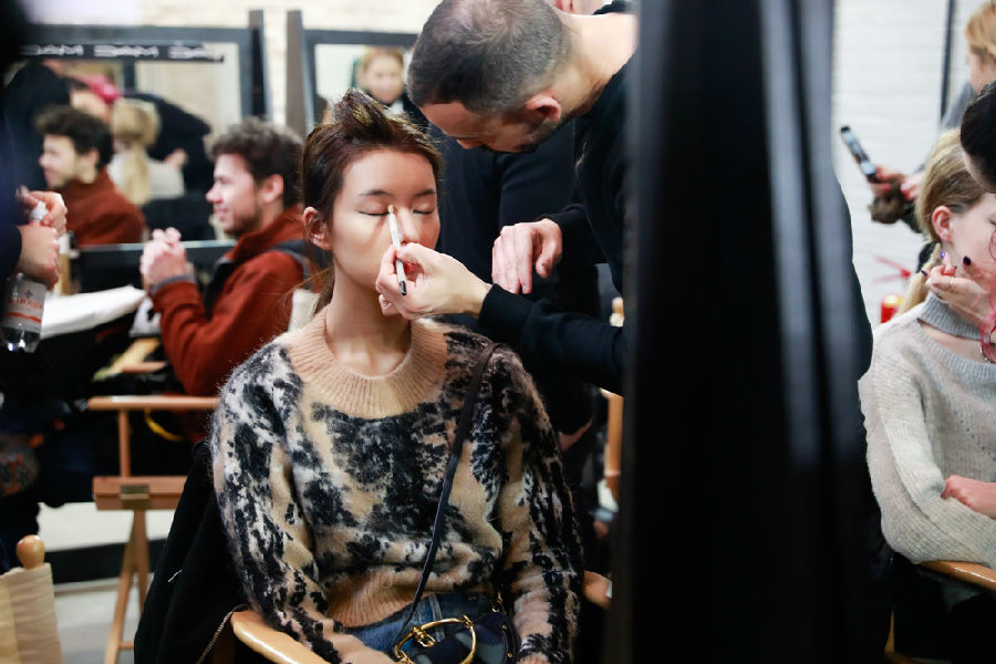 朱美逸:我今天的妆可能会比较有创意一些,因为T台的妆容和我们平常拍广告或者画册的妆容不太一样,今天的妆容会比较个性一些,大家可以看到我的下眼线会比较重,然后眼尾有上扬的这么一个处理。