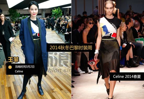 王菲2014秋冬巴黎时装周celine秀场,王菲身着Celine蓝色西装领长大衣,内搭Cline 2014春夏涂鸦印花Tee与玄色透视百褶纱裙,一身装扮爽利清新。