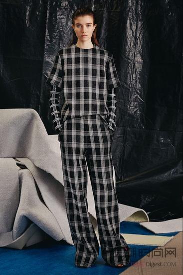 格纹计划是很多设计师每一季都市推出的单品和搭配,在Proenza Schouler的早秋系列中以最为经典和百搭的好坏格纹为基底,圆领短袖上衣搭配正盛行的复古宽腿裤,连裸露的手臂都没有被忘记,内搭也因此同种气势派头显现。依据面料的选择而出现出的黑灰色质感充足漂亮,模特搭配湿发造型和露趾高跟鞋显现出套装的经典和百搭。
