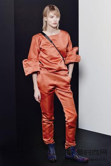 Bottega Veneta的早秋系列中Sasha Luss演绎的这一套橘赤色套装颇为抢眼,聚集计划的层叠袖口和搭配的蓝紫色皮质踝靴非常抢镜,而绸缎的选材非常奇特,以上衣和长裤的情势演绎出如许的气势派头简直是混搭出一种新的格调。