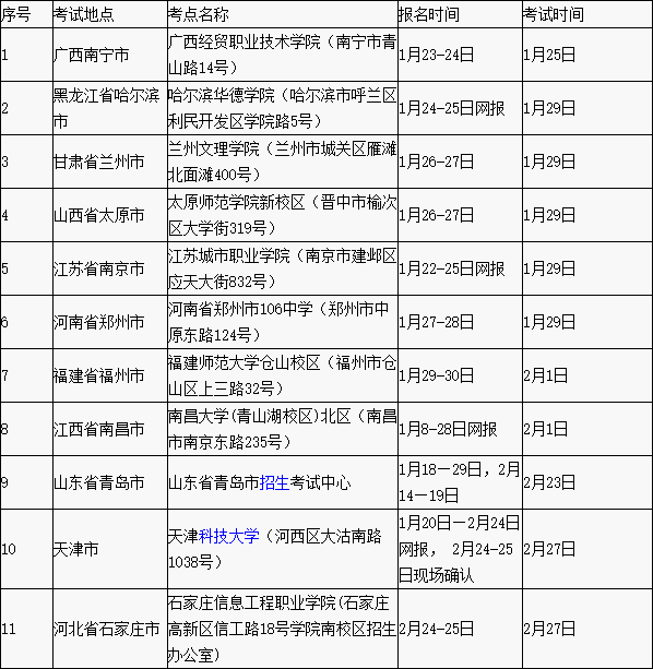 注:①天津考点报名网址:http://zsjy.tust.edu.cn/zhaosheng/bm/ ,青岛考点报名网址:http://wsbm.sdzk.gov.cn, 哈尔滨考点报名网址http://www.dfxyzj.com/,南昌考点报名网址:http://www.jxeea.cn。